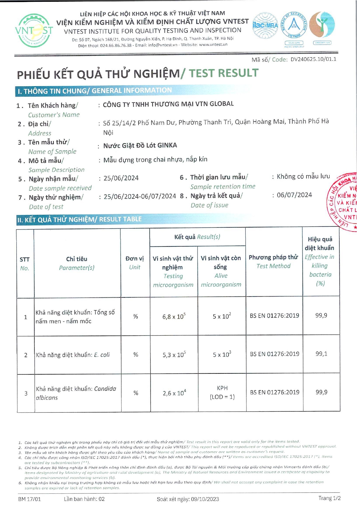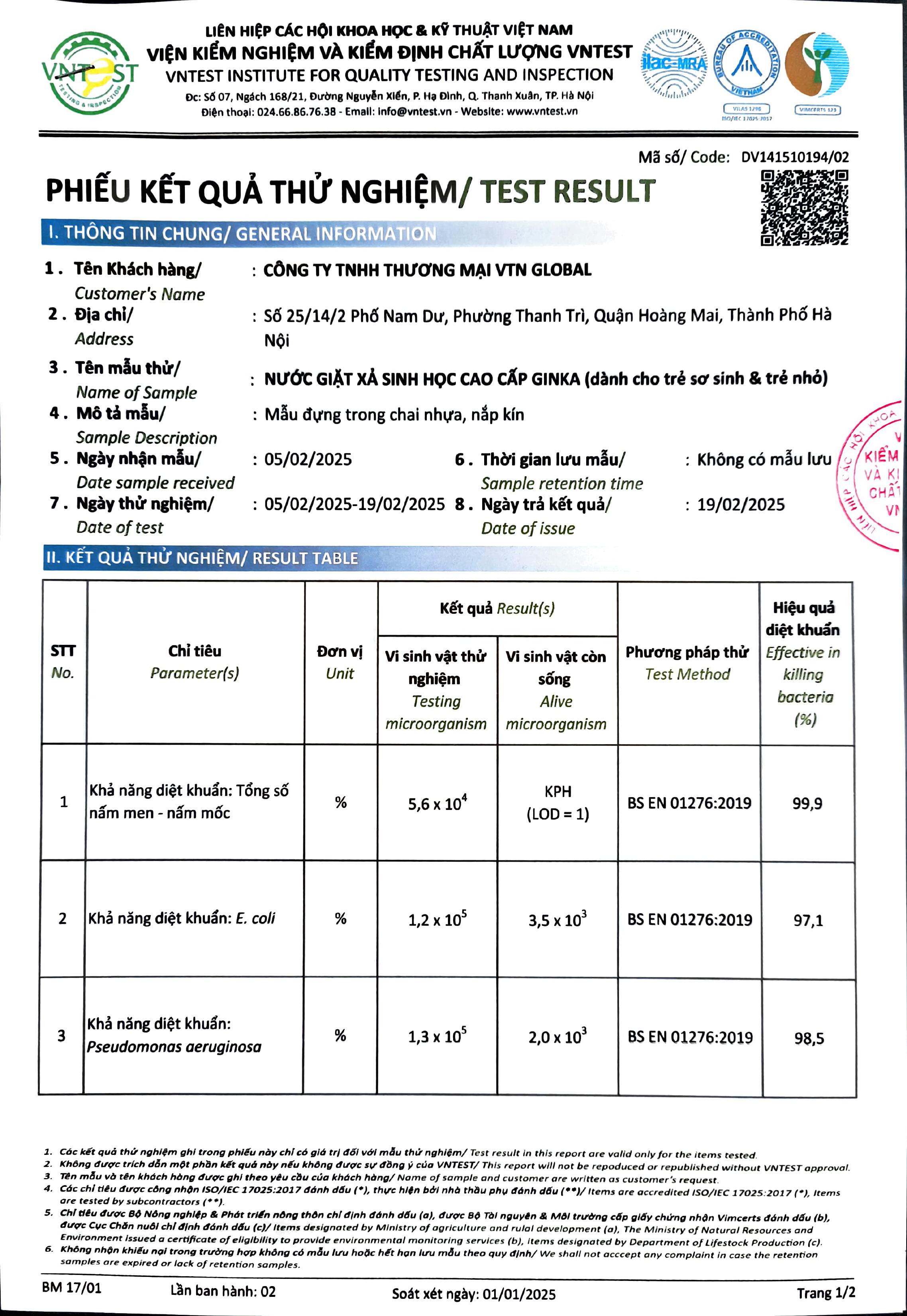 Chứng nhận diệt khuẩn của VNTEST