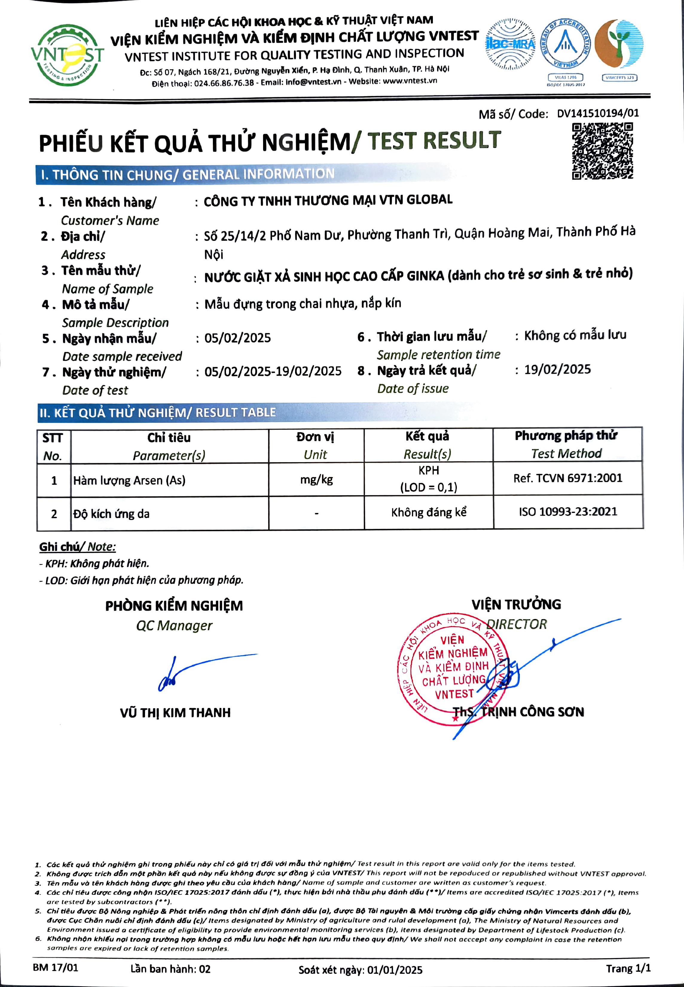 Chứng nhận sản phẩm không gây kích ứng VNTEST