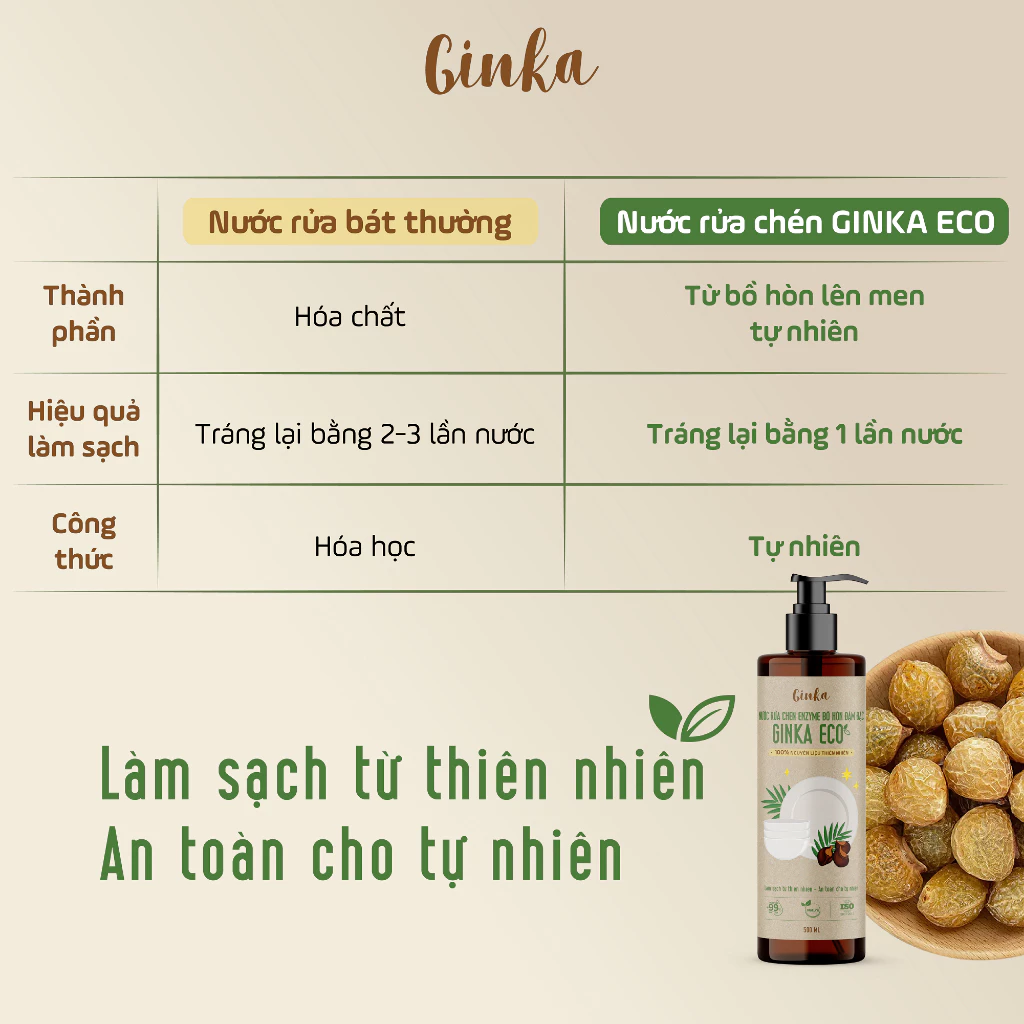 GINKA ECO được nghiên cứu, sản xuất từ 100% nguyên liệu thiên nhiên gồm quả bồ hòn ủ cùng rỉ mật, trái dứa